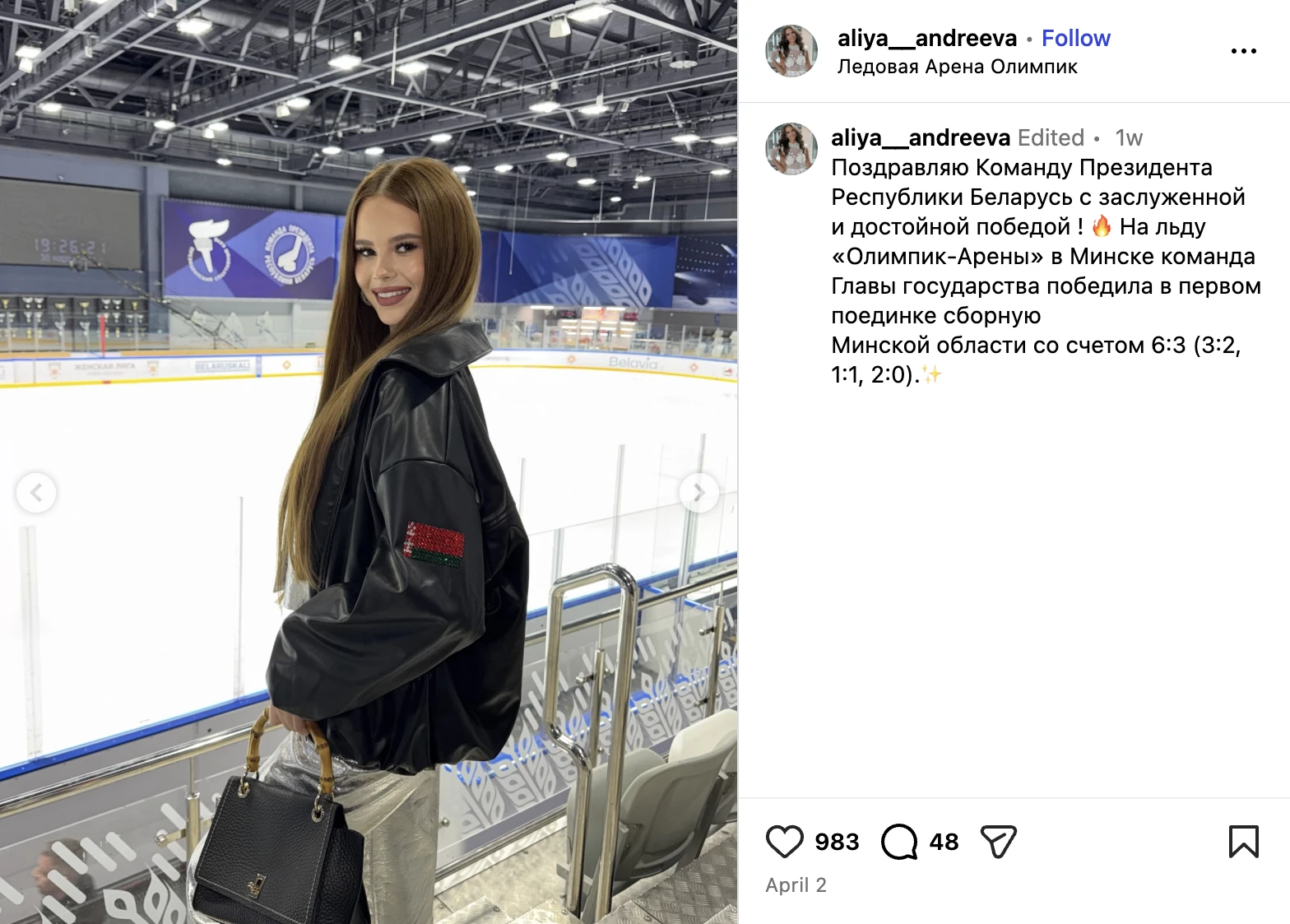 В начале апреля завершились соревнования Республиканской хоккейной лиги. Победу в чемпионате в 17-й раз одержала команда Александра Лукашенко. За финальным матчем с VIP-трибуны следила Алия Короткая, облачившись в куртку с надписью «Мисс БРИКС».