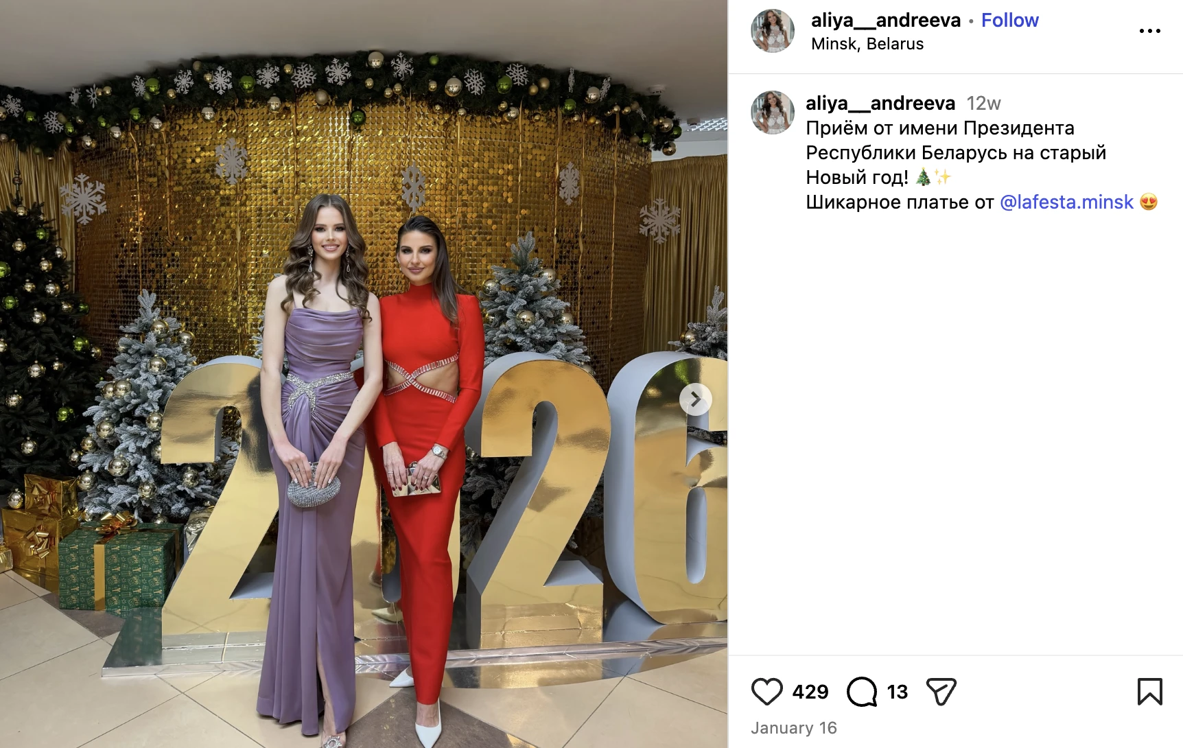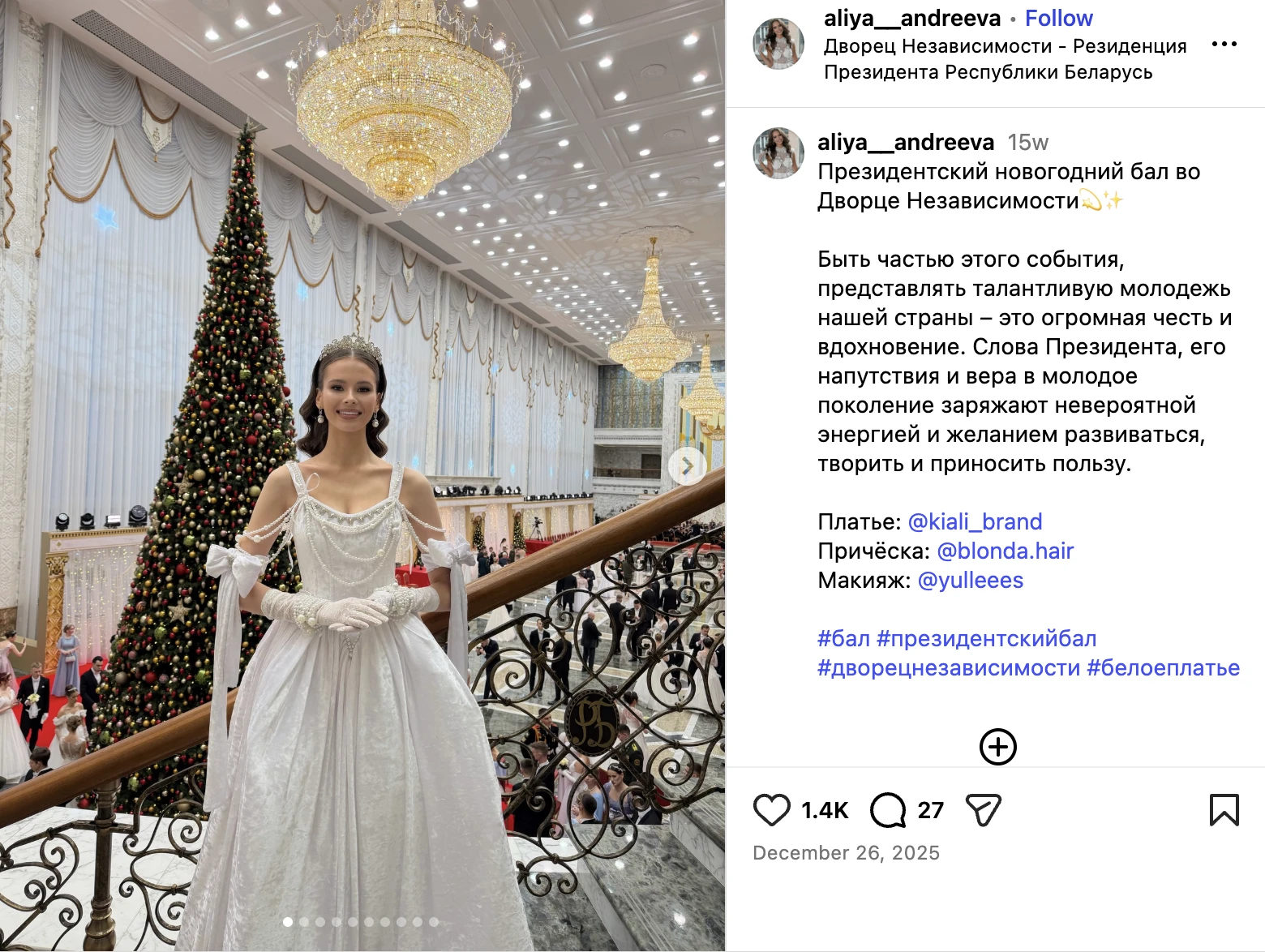 Алия Короткая на новогоднем балу Александра Лукашенко, декабрь – 2025. Источник: инстаграм-аккаунт Алии Короткой