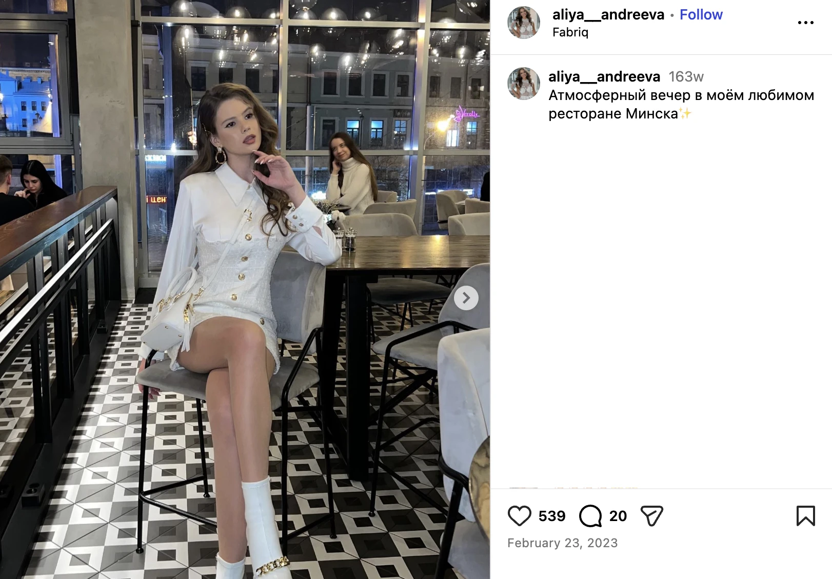 Кроме того, в соцсетях Алия публиковала фото из элитного ресторана Fabriq и называла это место «любимым». Им совладеет свояк Дмитрия Лукашенко – Владимир Кулаков.