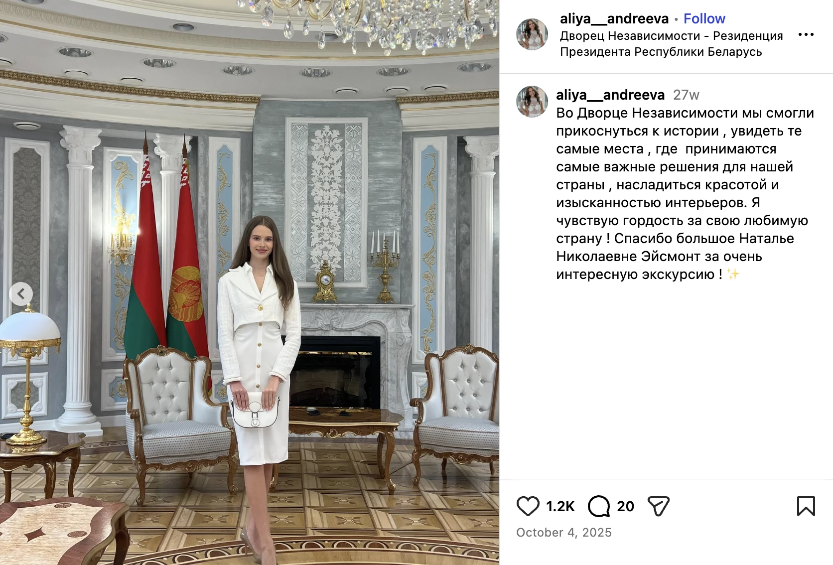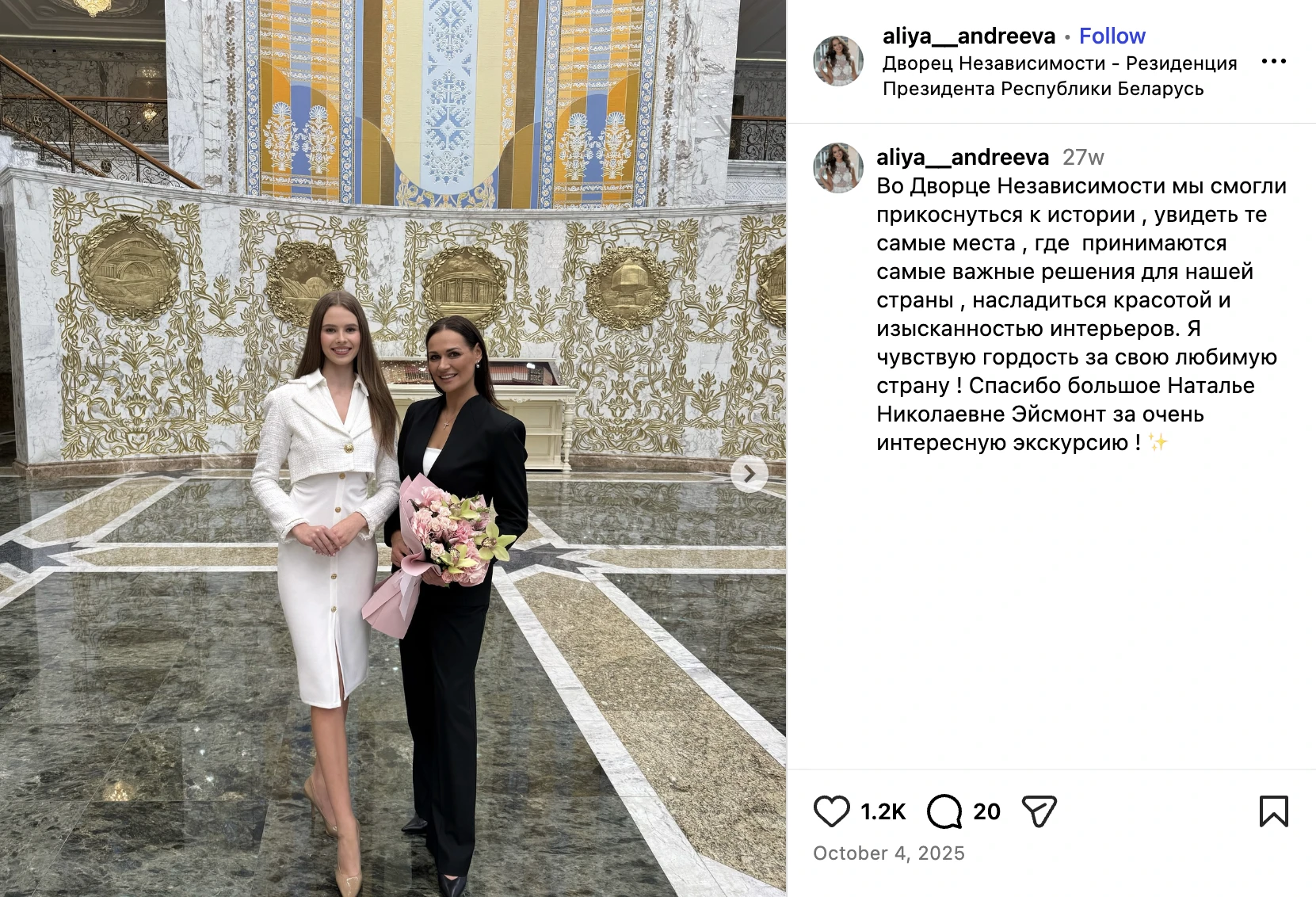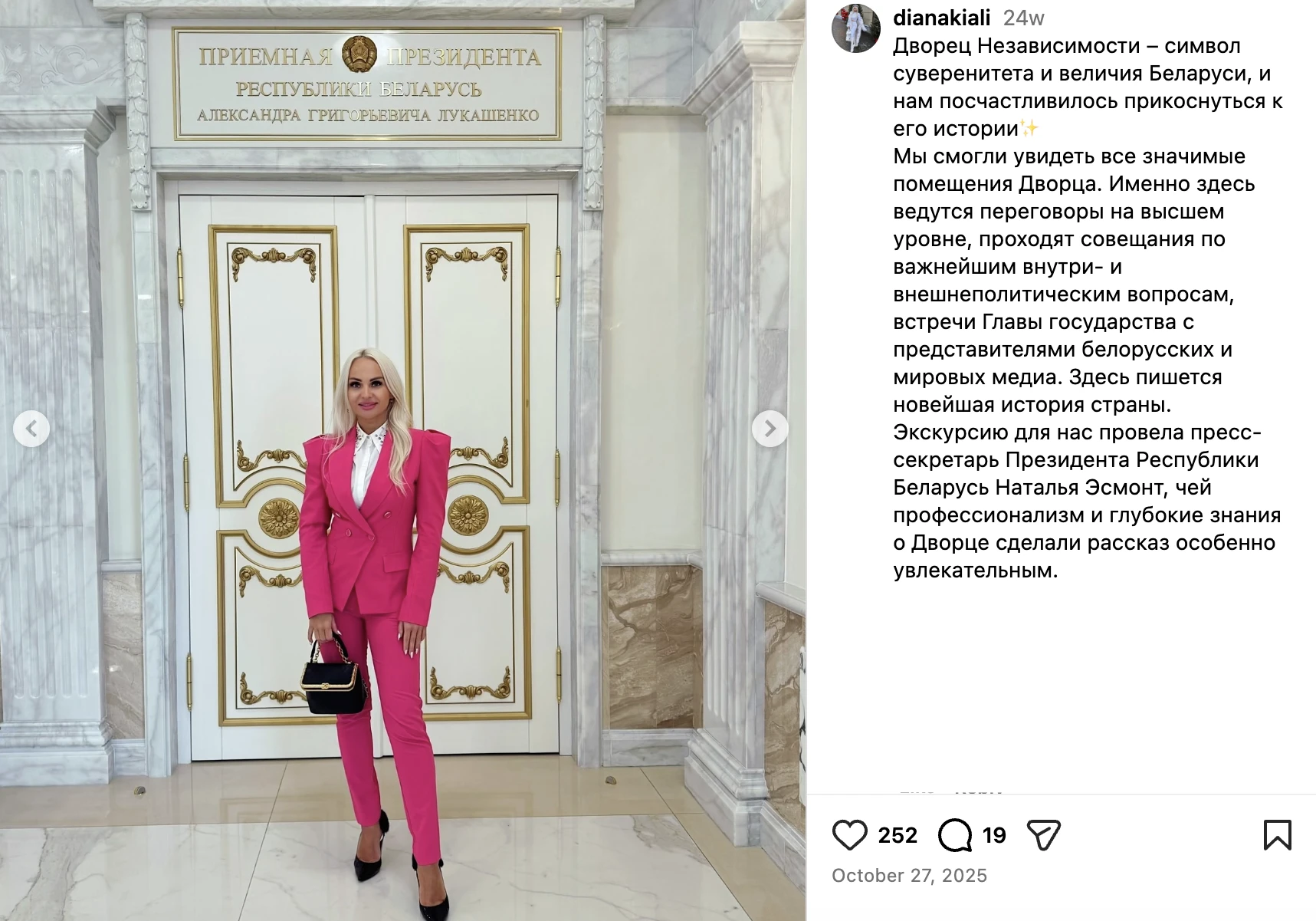 Также Короткая – желанная гостья во Дворце независимости. В октябре 2025 года экскурсию ей там провела Наталья Эйсмонт, пресс-секретарь Лукашенко.