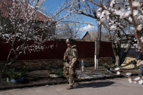 24 апреля, Киев. Раненая жительница столицы сидит возле своего дома после российской атаки